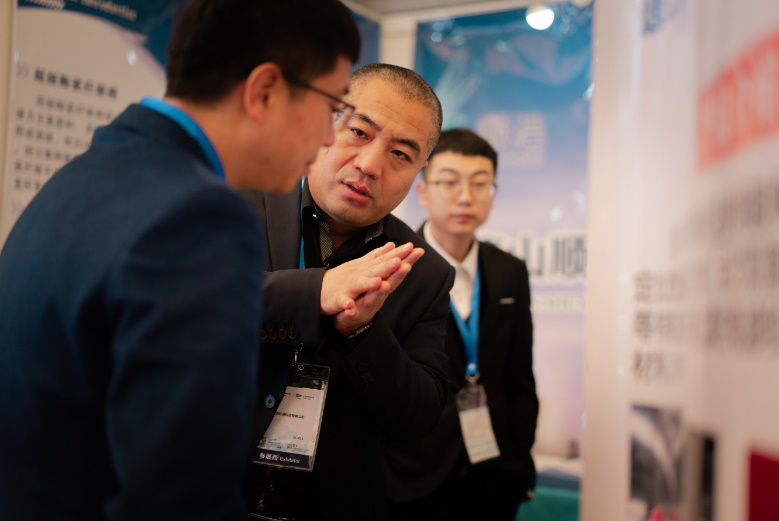 公司參展人員正向采購(gòu)商演示產(chǎn)品厚度優(yōu)勢(shì)