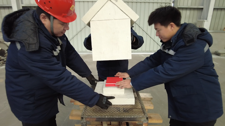 公司針對產(chǎn)品“順浩陶瓷棉板”的防火性能和保溫性能進行了一項實景測試,用來驗證陶瓷棉板的A1級防火性能和好的保溫性能。實驗過程:將木條堆在金屬架中,房子放至金屬架上,巧克力放入房子內(nèi)部后將木條點燃,計時3分鐘。時間到,將明火撲滅,打開房子,取出巧克力,肉眼觀察巧克力形態(tài),并試吃。